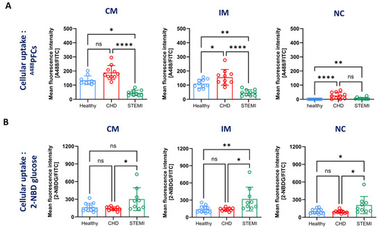 ST-elevation myocardial infarction is associated with the death of a large number of cardiomyocytes and the release of damage-associated molecular patterns (DAMPs) [54]. These DAMPs initiate a strong proinflammatory reaction that also leads to the activation of monocytes [55]. In agreement with this, we found an increased uptake of 2-NBDG in all monocyte subsets in patients with STEMI compared with healthy volunteers and patients with CHD (Figure 5B). A study by Palmer et al. [35] revealed an equal uptake of 2-NBDG in classical, intermediate and non-classical monocyte subsets. However, this study also found an increased 2-NBDG uptake in all subsets in patients with HIV compared with healthy controls [35]. These findings are in line with the concept that the activation of monocytes results in an increased uptake of glucose and a switch from an oxidative to a glycolytic metabolism [56]. Although it has been reported that monocytes in patients with CHD display an activated phenotype [57], the uptake of 2-NBDG was similar to healthy human volunteers. However, Dietl et al. found only a slight increase in glucose uptake in LPS-stimulated monocytes but a strongly increased generation of lactic acid [56]. Therefore, it could be possible that patients with CHD have activated monocytes that do not take up larger amount of glucose but switch towards a glycolytic metabolism.