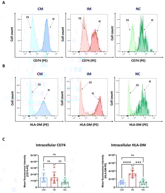Intracellular staining of HLA-DM and CD74 in monocyte subsets. Blood samples were derived from young healthy volunteers. Cells were first stained with antibodies against CD11b, CD14, CD16 and HLA-DR to identify classical (CM, blue), intermediate (IM, red) and non-classical monocytes (NC, green). Subsequently, the samples were additionally stained for CD74 (A) or HLA-DM (B) to determine the surface expression (CS). Alternatively, immune cells were fixed and permeabilised and treated with anti-CD74 and HLA-DM antibodies to detect intracellular (IC) expression levels. Light colours represent the expression of CD74 and HLA-DM on the cell surface, darker colours depict intracellular expression. (C) Quantitative analysis of the mean fluorescence intensities (MFI) of intracellular CD74 (left) and HLA-DM (right). Data are mean values ± SD, n = 5–6 (4 × female, 2 × male; 22–33 years, median: 25 years). Normality was tested using a Shapiro–Wilk test and variability with Levene’s test. Differences between the groups were analysed by a one-way ANOVA followed by Tukey’s multiple comparisons test. Statistical significance: ns—not significant, *** p < 0.0001, **** p < 0.0001.