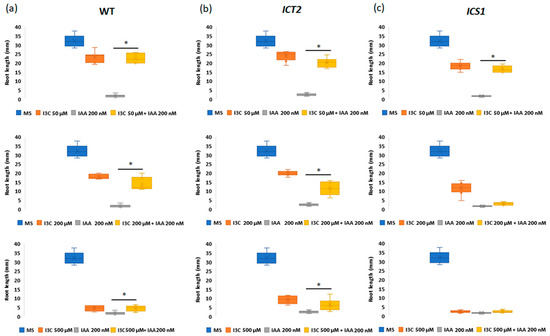 For this purpose, we monitored the root lengths of seedlings grown for 14 days on a medium containing various concentrations of auxin, I3C, or both. As expected, in all lines, roots grown in the presence of auxin were significantly shorter than the roots of plants grown on MS (
