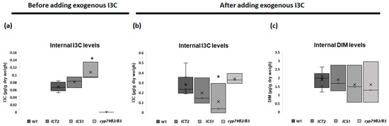 Common mechanisms of tolerance to chemical exposure include detoxification and reduced uptake. The amount of internal I3C was significantly higher in ICS1 compared to WT, where, on the other hand, the I3C amount absorbed from the growing media was significantly lower. These results suggest that the susceptibility of ICS1 to external I3C could be a result of increased levels of internal I3C rather than I3C uptake from the medium, and this susceptibility could be rescued by reducing the amount of internal I3C.