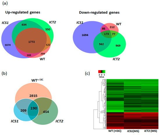 RNA-Seq: Three lines were used for NGS: Col-0, ICT2ami0, and ICS1ami0. The seedlings were grown hydroponically for 10 days. Three biological pooled samples (20 seedlings per sample) were collected for each treatment. In all treatments, solutions of DMSO and 400 µM of I3C were prepared in MS medium and added to the liquid medium of hydroponic growth, which was incubated for 2 h. All samples were collected at the same time of day to eliminate any circadian effect.