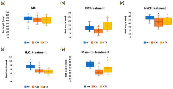 ICS1, and WT seedlings on MS media containing 200 nM IAA, 160 µM INA, 200 µM DIM, 200 µM I3CxA, and 375 µM MI3CX. MS plates and plates with MS containing 500 µM I3C were used as controls. The roots of the mutants were measured and compared to the WT, and the results are presented in