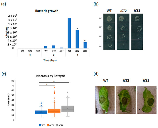 ICS1, and WT and placed in a hermetically sealed box. A 7 µL drop of 105 Botrytis solution mixed with tween-20 was dropped on each leaf. The leaves were scanned after four days and necrosis areas on the leaf were measured. The results presented in