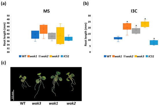 ICS1ami0 (WAK1, WAK2, and WAK3) were tolerant to I3C, as exhibited by longer roots than the wild-type when grown on 500 µM I3C (