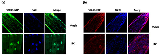 Figure 13 presents the results of the fluorescent lines WAK1:GFP and WAK2:RFP. As expected, WAK1 and WAK2 were detected in the cell membrane in normal conditions. However, WAK1 was detected in the nucleus following I3C treatment, while WAK2 was seen in small vesicles in the cells. Thus, I3C treatment influences the subcellular localization of WAK1 and WAK2, though the physiological implication of this is unknown.