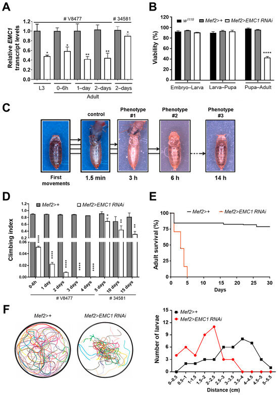 RNAi-mediated silencing of EMC1 in the Drosophila muscle leads to pupal lethality and severe motor disabilities in adults and larvae. (A) EMC1 transcript levels were calculated as described in the Section 2 for individuals of the indicated genotype, using either the VDRC RNAi line V8477 or the BDSC RNAi line 34581. Transcripts were normalized by the levels of EMC1 in the Mef2>+ control at the indicated developmental time. (B) Viability was calculated as the percentage of individuals of the indicated genotype that reached the next developmental stage. (C) The adult eclosion process is represented from frames of movies recorded for Mef2>+ control and Mef2>EMC1 RNAi V8477 individuals with various degrees of phenotype severity (#1, #2, and #3). The initial time represents the first adult movements still inside the puparium, until the animals leave the pupal case (WT and phenotype #1) or notably fail to do so (#2 and 3). See details in Videos S1A–C. (D) Locomotion of adult individuals of the indicated genotypes and ages was evaluated as the average (±S.D.) climbing abilities. *, **, and **** indicate, respectively, p < 0.05, p < 0.01, and p < 0.0001, according to Student’s t-tests applied between Mef2>+ controls and Mef2>EMC1 RNAi animals. Adult life span (E) and larval locomotion (F) analyses were performed as described in the Section 2 using Mef2>+ controls and Mef2>EMC1 RNAi V8477 individuals. Individual larval crawling paths are represented in different colors in (F) (left panel).