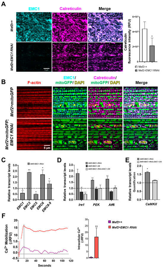 EMC1 is required for maintenance of the sarcoplasmic reticulum network and cytosolic calcium homeostasis. Immunofluorescent confocal microscopy images (Z-stacks) of representative indirect flight muscles of Mef2>+ and Mef2>EMC1−RNAi adults stained with anti−EMC1 and anti-calreticulin; right panel, average (±S.D.) level of calreticulin relative fluorescence intensity. (A), and of Mef2>mitoGFP and Mef2>mitoGFP;EMC1−RNAi adults stained with anti-EMC1, anti-calreticulin, rhodamine-phalloidin, and DAPI (B). (C–E) Transcript levels of the indicated genes were calculated as described in the Section 2 for 2-day-old adult individuals of the indicated genotypes, normalized by the levels in the Mef2>+ control. (F) Left panel, representative real-time Fluo−4 AM measurements of calcium mobilization in the thoracic muscle of 2-day-old adults of the indicated genotypes; right panel, average (±S.D.) level of intracellular calcium at the timepoint of signal saturation (indicated by a vertical dashed line on the left panel). ΔRFU, change in relative fluorescence units. * and ** represent, respectively, p < 0.05 and p < 0.01, according to Student´s t-tests applied between the Mef2>+ controls and Mef2>EMC1−RNAi, Mef2>EMC1−OE or Mef2>EMC1−OE;EMC1-RNAi animals. For RT−qPCR experiments, five thoraces were used for each biological replicate, with a total of three replicates utilized per phenotype and one hundred thoraces from 2-day-old flies were divided into five groups for the calcium experiments.