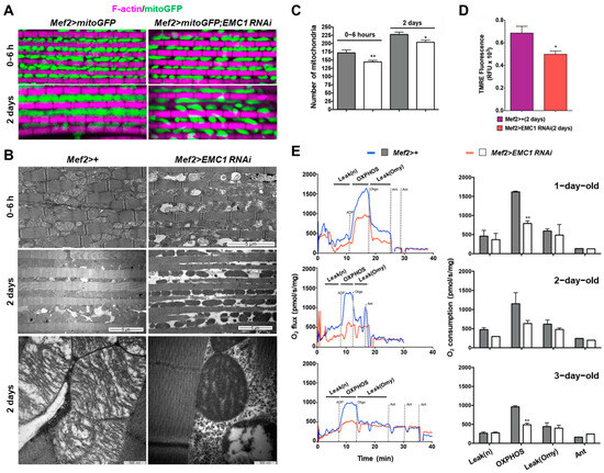 EMC1 silencing results in severely altered mitochondrial morphology, lower membrane potential, and lower oxidative phosphorylation in adult indirect flight muscles. Immunofluorescent confocal microscopy images (A) and transmission electron microscopy of longitudinal sections (B) of representative thoracic indirect flight muscles of adult flies of the indicated genotype and age. Samples were stained with rhodamine-phalloidin in (A). (C) Quantification of intermyofibrillar mitochondria data shown in (A,B). (D) TMRE signal from isolated thoraces of 2-day-old adults was obtained through fluorescence reading using the FlexStation 3 Benchtop Multi-Mode Microplate Reader, indicating the genotype and showing relative mitochondrial membrane potential. RFU, relative fluorescence units. (E) Representative traces (left panels) and quantification (right panels, average ±S.D.) of oxygen consumption rates of 1- to 3-day-old adult thoraces. Dissected tissues were incubated in the Mir05 respiration buffer in the presence of pyruvate, malate, and glutamate (Leak (n) respiratory state), followed by addition of ADP (OXPHOS respiratory state), oligomycin (Leak (Omy) respiratory state), and finally antimycin A (Ant, non-mitochondrial respiration), as described in the Section 2. * and ** represent, respectively, p < 0.05 and p < 0.01, according to Student´s t-tests applied between the Mef2>+ controls and Mef2>EMC1-RNAi animals.