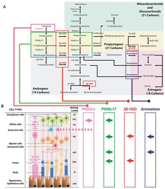 Disruptions in these intricate pathways can lead to various inherited or age-associated visual impairments [20]. Recently, evidence has suggested that locally synthesized steroids are essential in maintaining retinal health, particularly in conditions of oxidative or ischemic stress [19].