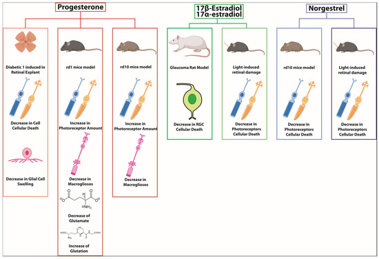 Progesterone, estradiol, and norgestrel have shown protective effects in different retinal animal models such as diabetic 1 retinopathy, rd1 mice, rd10 mice, glaucoma, or light-induced retinal damage. The action mechanism has been related to inflammation or oxidative decrease [37,72,73,74,75,76].