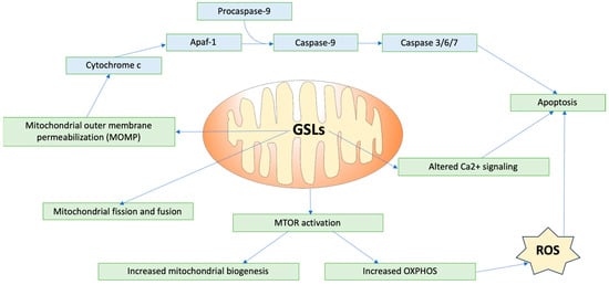 Effects of GSLs on mitochondrial processes. ROS = reactive oxygen species; OXPHOS = oxidative phosphorylation; mTOR = mechanistic target of rapamycin, Apaf-1 = apoptotic protease activating factor 1.