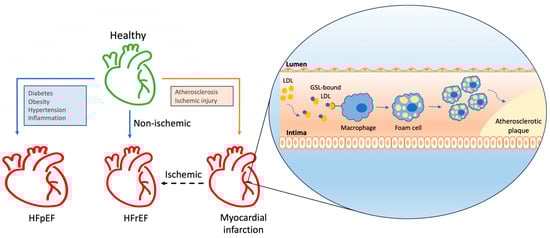 GSL involvement in atherosclerosis, leading to heart failure. HFpEF = heart failure with preserved ejection fraction; HFrEF = heart failure with reserved ejection fraction; LDL = low-density lipoprotein.
