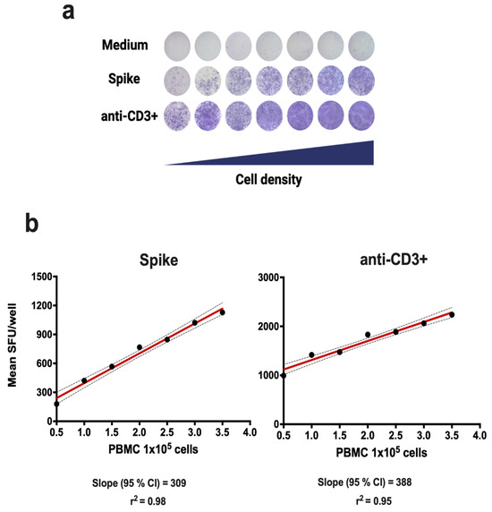 Linearity of the ELISPOT-IFNγ assay. The linearity of the method was evaluated in PBMCs from a single donor following 18 h of incubation with medium, Spike S1 protein, or anti-CD3+ antibody (positive control). (a) Scanned images of SFUs/well for PBMCs. The 95% confidence intervals (CIs) are shown in (b).