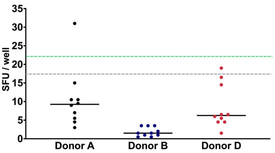 IFN-γ LOD and LLOQ characterization. The PBMC of three donors were cultured in OPTmizer medium and analyzed 10 times. Using the average of the results of each volunteer, the LOD of 17 spots/well (dotted gray line) and LLOQ of 22 spots/well (dotted green line) were calculated. Data are shown as the mean of the SFUs of each donor.
