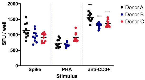 In our validation protocol, we incorporated the use of PHA, as an additional positive control, since it stimulates the production of IFNγ in PBMCs [23,34]. Surprisingly, lower levels of spots were detected after PHA stimulation when compared with the anti-CD3+ antibody, and significant differences were found when comparing the SFUs after PHA or CD3+ exposure in each donor (p < 0.0001).