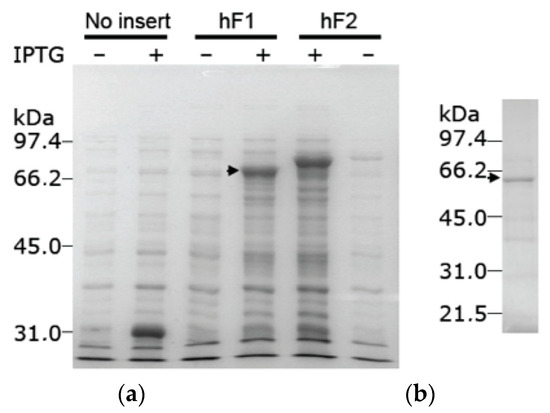 Expression of the recombinant protein isoform X8, encoded by an alternatively spliced tkfc_ins56-type transcript. (a) IPTG-dependent expression of GST fusion proteins in supernatant lysates of E. coli BL21 cells transformed with plasmids pGEX-6P-3 (without insert), pGEX-6P-3-hF1 (bearing the tkfc_ins56-type ORF) or pGEX-6P-3-hF2 (bearing the tkfc-type ORF [1]). Inserts were cloned in frame with the GST tag. (b) Protein recovered from the GST-tagged expression product after adsorption to GSH-Sepharose and overnight in-column proteolysis with PreScission® protease. The arrowheads mark the GST fusion proteins with isoform X8 (a) or the protein separated from the GST tag (b). Original images of (a,b) can be found in Supplementary Materials.