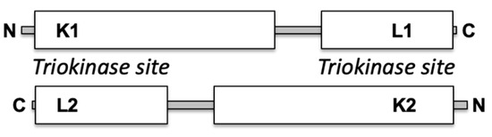 TKFC is a homodimeric protein of two-domain monomers, each containing a K domain (N-terminal) and an L domain (C-terminal). In the homodimer, two triokinase active sites are formed between the K1–L2 and the K2–L1 domains (Scheme 1). In contrast, the FMN cyclase activity requires only the L domain, although full cyclase efficiency also needs the K domain [2]. Interaction of TKFC with MDA5 occurs through the K domain, which, when tested in isolation, is an effective inhibitor of MDA5-mediated innate immunity comparable to the effect of the full TKFC protein [16].