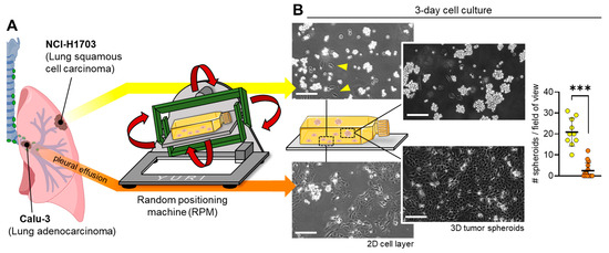 On the RPM, two-dimensional cultures of different lung carcinoma cell types resulted in different subpopulations. (A) While NCI-H1703 squamous cell carcinoma cells (yellow line, top) mainly formed 3D aggregates after 3 days of rotation (some of the few adherent cells are indicated by yellow arrows), Calu-3 adenocarcinoma cells (orange line, bottom) remained almost completely as a two-dimensional cell layer. (B) Microscopic images of the cell culture after 3 days of dynamic culture on the RPM. The bar chart shows the number of spheroids per microscopic image. Scale bar: 200 µm. Non-parametric Mann–Whitney U test *** p ≤ 0.001. Parts of the figure were drawn using pictures from Biorender.com and Servier Medical Art.