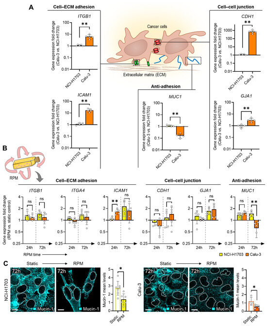 To better understand the different spheroid-formation behaviors, the gene expression of different cell–cell, cell–extracellular matrix (ECM) and anti-adhesion molecules was investigated. We have already recognized in a previous RPM study that the balance between adhesion and anti-adhesion proteins can influence RPM-induced spheroid formation [14]. At the transcription level, these factors were already present in different amounts in the two cell lines studied. In static cell culture, Calu-3 cells showed a higher basal expression in adhesion proteins (ITGB1, ICAM1, CDH1, GJA1), and a lower expression of the anti-adhesion gene MUC1 compared to NCI-H1703 cells (Figure 2A).