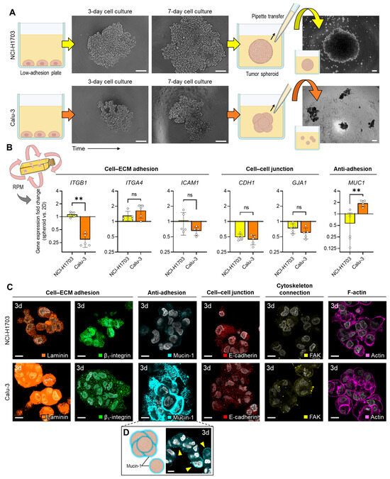(A) Spheroid formation of NCI-H1703 and Calu-3 cells in low-adhesion plates within 7 days. The two cell lines show a different spheroid morphology. Mechanical influences (such as pipetting) led to the disintegration of 7-day Calu-3 tumor spheroids. Scale bar: 200 µm. (B) Gene expression changes in spheroid cells compared to 2D culture on RPM after 3 days (n = 5). (C) Immunofluorescence of laminin, β1-integrin, mucin-1, E-cadherin, focal adhesion kinase (FAK) and F-actin combination in a 3-day culture (n = 5 for each condition; one representative picture is shown). Nuclei are stained with DAPI (gray). Scale bar: 10 µm. (D) Typical mucin-1 distribution in a Calu-3 spheroid structure around the subaggregates (yellow arrows). Scale bar: 10 µm. Non-parametric Mann–Whitney U test ** p ≤ 0.01, ns non-significant. Parts of the figure were drawn using pictures from Biorender.com and Servier Medical Art.