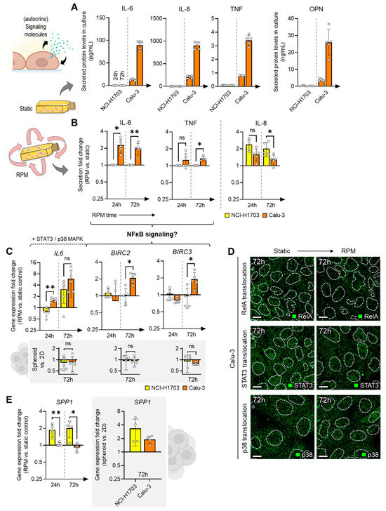 (A) Protein levels in the supernatant of static cell cultures of NCI-H1703 and Calu-3 after 24 and 72 h. (B) Effects of RPM cell culture on the content of secreted proteins. (C) Expression changes in NFκB target genes during RPM cell culture (n = 5). The small diagrams in the gray box describe the changes in gene expression in tumor spheroid cells. (D) Immunofluorescence of RelA, STAT3 and p38 in a 3-day culture (n = 4–5 for each condition; one representative picture is shown). Outlines of the nuclei as indicated using DAPI staining depicted as dashed lines. Scale bar: 10 µm. (E) Expression changes in SPP1 during RPM cell culture (n = 4–5). Non-parametric Mann–Whitney U test * p ≤ 0.05, ** p ≤ 0.01, ns non-significant. Parts of the figure were drawn using pictures from Biorender.com and Servier Medical Art.