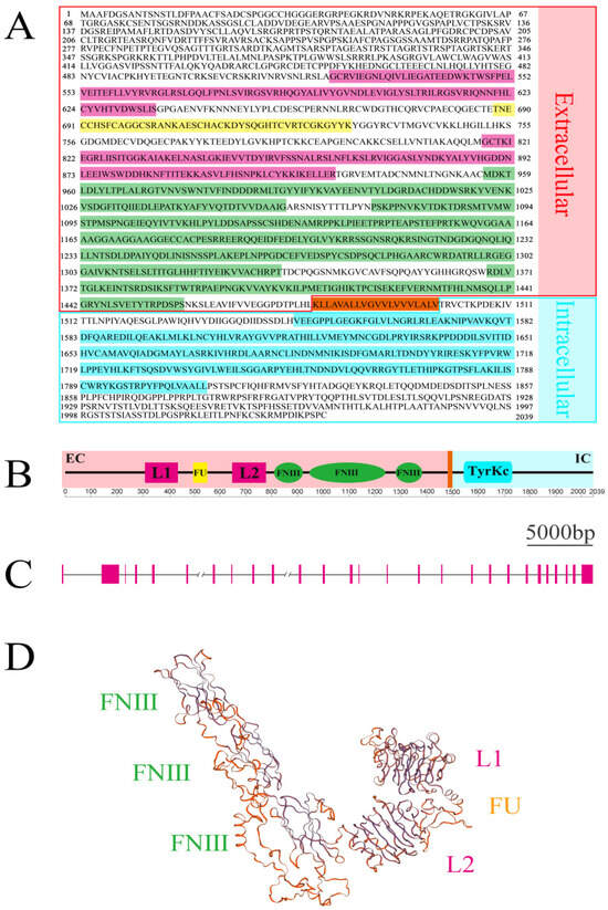 Amino acid sequence and structural prediction of LvIR. (A) The derived amino acid sequence of LvIR, including two ligand-binding domains (highlighted with a purple background), one furin-like domain (yellow background), three FNⅢ domains (green background), one transmembrane domain (orange background), and one tyrosine kinase domain (blue background). The intracellular and extracellular regions are emphasized by blue and pink boxes, respectively. (B) Functional domain prediction of LvIR. The colors of the functional domains and transmembrane region are consistent with those in (A). (C) Exon-intron diagram of LvIR DNA. Pink boxes represent exons, and black horizontal lines represent introns. Double slashes indicate an unknown length. (D) Three-dimensional protein model of the extracellular region of LvIR. The locations of the corresponding functional domains are indicated.