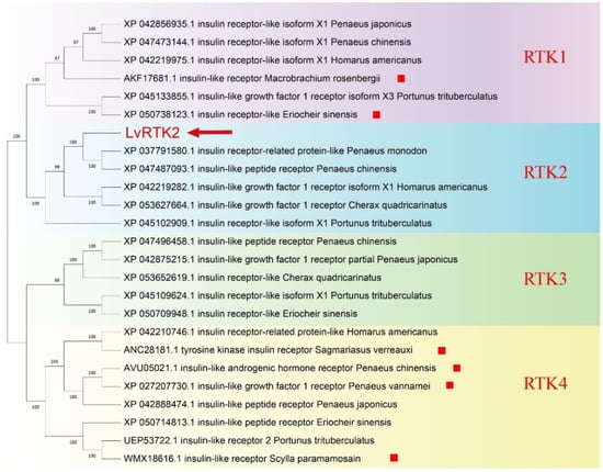 Phylogenetic relationships of insulin-like receptors in decapoda crustacean. The numbers on the forks are the bootstrap proportions for each branch. The red arrow indicates LvRTK2 found in this study, and the red boxes represent the insulin-like receptors that have been reported.