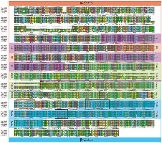 The predicted IR sequences from other decapoda species (Penaeus merguiensis, Penaeus chinensis, and Penaeus monodon) were obtained from NCBI and aligned with the LvRTK2 sequence for multiple sequence comparison. The results showed that RTK2 is highly conserved at the sequence level among decapod species, especially in critical functional domains like the L1/L2, FU, FNIII, and TyrKc domains (Figure 3).