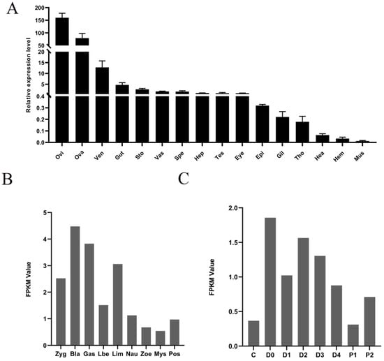 The expression profile of LvRTK2 across 16 adult tissues was detected using qRT-PCR. The results showed significant differences in LvRTK2 gene expression levels among different tissues, with the highest expression levels found in the oviduct and ovary, followed by the ventral nerve cord, gut, stomach, vas deferens, sperm atophore, hepatopancreas, testis, and eyestalk, while the expression levels in the remaining tissues were relatively low (Figure 4A).