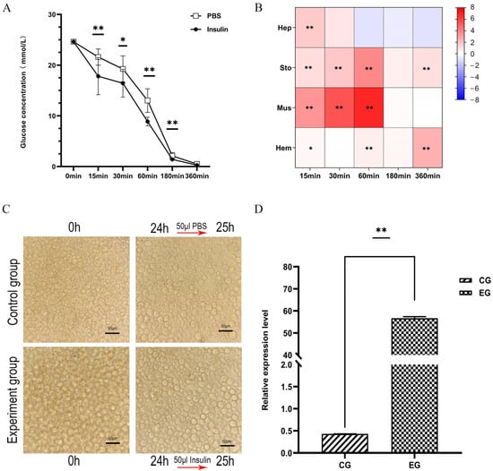 Effects of exogenous insulin treatment on glucose levels and LvRTK2 expression. (A) Changes in serum glucose concentration after in vivo exogenous insulin injection. (B) Log2 fold changes of LvRTK2 expression between the experimental and control groups after exogenous insulin injection. Red indicates up-regulation and blue indicates down-regulation. (C) Images of primary hepatopancreatic cells treated. (D) Changes in LvRTK2 expression under in vitro exogenous insulin treatment between the control group (CG) and experimental group (EG). Error bars represent standard deviation. Statistical significance is indicated as * p < 0.05 and ** p < 0.01.