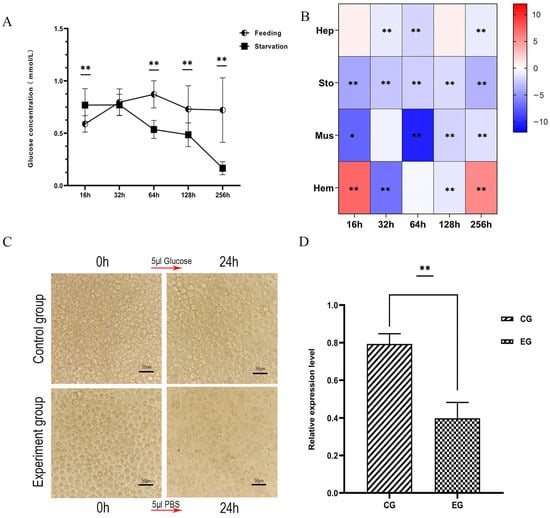 Effects of starvation treatment on glucose levels and LvRTK2 expression. (A) Changes in serum glucose concentration after in vivo starvation treatment. (B) Log2 fold changes of LvRTK2 expression between the experimental and control groups after starvation treatment. Red indicates up-regulation and blue indicates down-regulation. (C) Images of primary hepatopancreatic cells treated. There is a significant decrease in cell density in the experimental group compared to the control group after 24 h of treatment. (D) Changes in LvRTK2 expression under in vitro starvation treatment between the control group (CG) and experimental group (EG). Error bars represent standard deviation. Statistical significance is indicated as * p < 0.05 and ** p < 0.01.