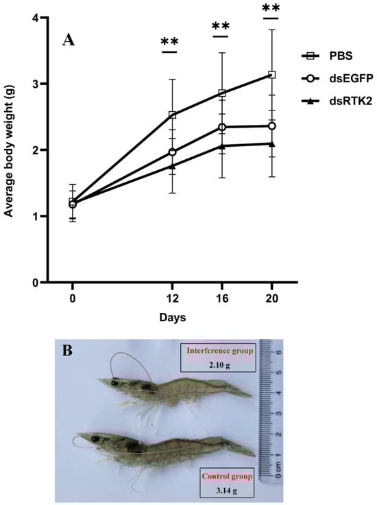 Measurement of shrimp body weight under long-term LvRTK2 interference. (A) Results of average body weight measurement. The asterisk symbol (**) indicates that there are significant differences between the dsRTK2 group and both the dsEGFP group and the PBS group (p < 0.01). (B) Representative photo showing differences in shrimp size between the experimental group and the control group after 20 days interference. The selected shrimp represent the average body weight. Error bars indicate standard deviation, with statistical significance as ** p < 0.01.