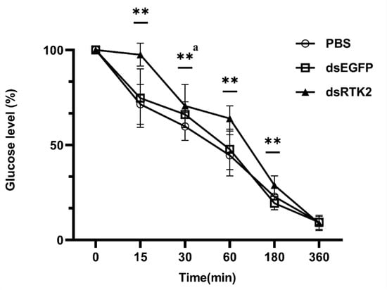 Measurement of serum glucose levels under short-term LvRTK2 interference. To present the results visually, the glucose concentration at the initial time is normalized to 100%, and the data for the remaining time points are correspondingly homogenized. Error bars represent the standard deviation. The statistical significance was ** p < 0.01 (where ‘a’ indicates that the dsRTK2 group data only show a significant difference compared to the control group).