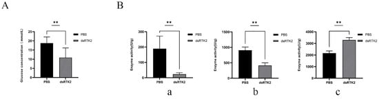 Measurement of glucose concentration and enzyme activity in the hepatopancreas after long-term LvRTK2 interference. (A) Changes in glucose concentration in hepatopancreas between the control group (PBS) and the interference group (dsRTK2). (B) Differences in the activity of glucose metabolism-related enzymes. (a): HK, (b): PFK, and (c): PEPCK. Error bars represent standard deviation. The statistical significance was ** p < 0.01.