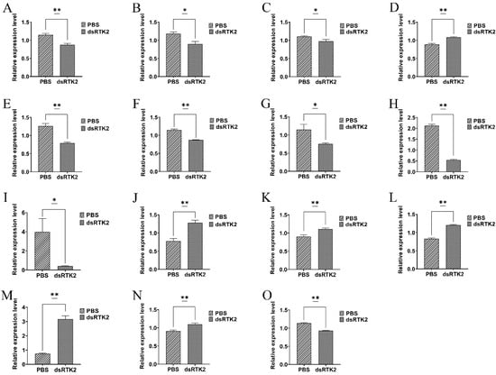Measurement of downstream gene expression in the hepatopancreas after long-term LvRTK2 interference. The changes in relative expression levels of genes including (A): PI3K, (B): PDK1, (C): AKT, (D): FOXO, (E): GLUT, (F): HK, (G): G6PI, (H): PGK, (I): PK, (J): G6PC, (K): FBP, (L): PEPCK, (M): PC, (N): GSK, and (O): GYS were measured. Error bars refer to the standard deviation. Statistical significance is marked as * p < 0.05 and ** p < 0.01.