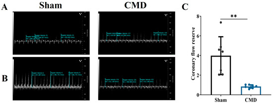 The two groups of rats were subjected to coronary blood flow measurements utilizing Doppler echocardiography. The results showed that the CMD group was significantly lower than the sham, with a CFR < 2, These results suggest that the CMD rat model was successfully constructed (Figure 1).
