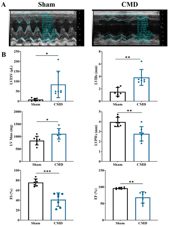 Echocardiographic tests were performed on rats in each group. Relative to the sham group, the CMD group exhibited a significant increase in left ventricular end-systolic volume (LVESV), left ventricular end-systolic diameter (LVIDs), and left ventricular mass (LV Mass). Conversely, there was a notable decrease in end-systolic left ventricular posterior wall thickness (LVPWs), left ventricular ejection fraction (EF), and left ventricular fractional shortening (FS) in the CMD group. These findings indicate compromised myocardial contractility and diminished cardiac function in the CMD rats (Figure 2).