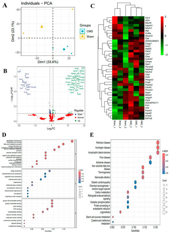 Different expression analyses and functional studies. (A) PCA of the identified proteins. (B,C) Volcano plots and heat maps showed the DEPs. The proteins whose expression increased in CMD are shown in green, and those whose expression decreased are shown in blue. The legend at the top right of the heat map represents log-fold changes in genes. The horizontal axis represents each sample and the vertical axis represents each protein. (D) GO enrichment analysis of the DEPs: biological process (BP), cellular composition (CC) and molecular function (MF). Count is the number of genes, a larger circle indicates a higher number of genes and vice versa. The x-axis indicates the ratio of the number of genes enriched to the target pathway to the total number of genes, and y-axis labels represent GO terms. (E) KEGG pathway annotation of the DEPs: Count is the number of genes, a larger circle indicates a higher number of genes and vice versa. The x-axis indicates the ratio of the number of genes enriched to the target pathway to the total number of genes, and y-axis labels indicate KEGG-enriched pathway.