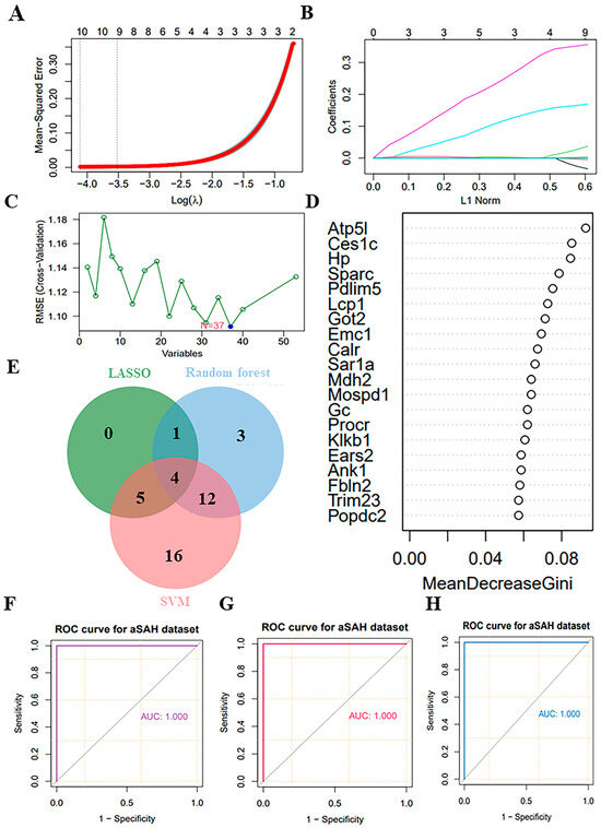 Screening candidate diagnostic markers from key proteins. (A,B) Lasso regression utilizing 53 key proteins. (C) SVM utilizing 53 key proteins. (D) Random forest utilizing 44 key proteins. (E) Venn diagram showed the intersection of key proteins selected by the three supervised machine-learning methods. (F–H) ROC curves for each pairwise prediction by 3 different machine-learning methods.