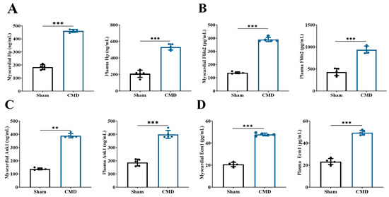 In this study, we conducted an analysis of 53 key proteins using three distinct machine-learning methodologies: lasso regression, random forest and SVM. These methods were employed to identify potential biomarkers. Based on the importance of features, lasso regression selected 10 proteins (Figure 6A,B), SVM selected 37 proteins (Figure 6C), and random forest selected 20 proteins (Figure 6D). Ultimately, all methods converged on four overlapping proteins (Figure 6E). The four overlapping proteins screened by all methods, endoplasmic reticulum membrane protein complex 1 (Emc1), ankyrin-1 (Ank1), fibronectin 2 (Fbln2) and hemoglobin-binding protein (Hp), were further used to construct diagnostic models. The area under the ROC of the candidate biomarkers was calculated to assess their discriminatory accuracy. As shown in Figure 6F–H, all the model AUC values (1.000) were the same, indicating that the diagnostic models constructed for these proteins and metabolites exhibited perfect diagnostic efficiency. Consequently, these molecules are highly likely to be selected as valuable diagnostic markers. Further validation of the above diagnostic markers using ELISA showed that the levels of Emc1, Ank1, Fbln2, and Hp were significantly elevated in the myocardium and plasma of rats in the CMD group compared to the sham group (Figure 7A–D).