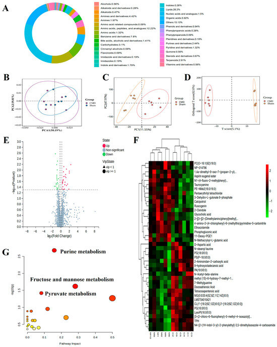 Comprehensive analysis of untargeted metabolomics in myocardial tissues of CMD and sham group rats. (A) The proportion of the identified metabolites in each chemical classification. Different colors indicate different metabolites classification entries, and percentages indicate the percentage of the number of metabolites in that category out of the number of all metabolites for which classification information is available. (B–D) PCA, partial least squares-discriminant analysis (PLS-DA), and OPLS-DA were performed on the identified metabolites to establish the relationship model between metabolite expression and sample category. (E,F) Volcano plots and heat maps of DEMs between CMD and sham group rats. The metabolites whose expression increased in CMD are shown in red, and those whose expression decreased are shown in green. The legend at the top right of the heat map represents log-fold changes in genes. The horizontal axis represents each sample and the vertical axis represents each metabolite. (G) Top significant functional pathways involved according to the DEMs. Each circle represents a metabolic pathway, the larger the circle, the greater the pathway impact.