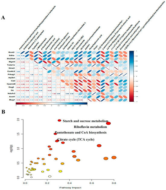 We next performed an integrative analysis to evaluate the relationship between DEMs and DEPs. Initially, we examined the correlation between the expression of DEMs and DEPs, specifically highlighting the correlation between the top 30 proteins and metabolites (Figure 9A). Following this, we then integrated DEM and DEP data into a combined pathway analysis, which led to the identification of several important pathways that play important roles in the pathophysiological processes of CMD, including starch and sucrose metabolism, riboflavin metabolism, pantothenate and CoA biosynthesis, citrate cycle (TCA cycle, Figure 9B). These metabolic pathways include four metabolites and six proteins, namely glucose 6-phosphate, flavin mononucleotide, adenosine 3′, 5′-diphosphate, malic acid, ectonucleotide pyrophosphatase phosphodiesterase 1 (Enpp1), 1, 4-alpha-glucan branching enzyme 1 (Gbe1), myophosphorylase (Pygm), branched chain amino acid transaminase 2 (Bcat2), succinate dehydrogenase complex flavoprotein subunit A (Sdha) and malate dehydrogenase 2 (Mdh2).