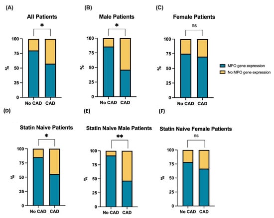 CAD patients were less likely to express MPO gene, as identified by qRT-PCR. Stacked bar plots showing the association between proportion in MPO gene expression and the presence of CAD in (A) all patients (n = 77; No CAD = 30, CAD = 47), (B) male patients (n = 40; No CAD = 14, CAD = 26) and (C) female patients (n = 36; No CAD = 16, CAD = 20). (D) Statin-naïve patients (n = 54; No CAD = 27, CAD = 27), (E) statin-naïve male patients (n = 27; No CAD = 12, CAD = 15) and (F) statin-naïve female patients (n = 26; No CAD = 14, CAD = 12). Statistical association was analysed using Pearson’s chi-square test (categorial variables). Categorical measurements are shown as percentages. * p < 0.05, ** p < 0.01.