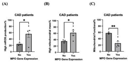 Previously, it was found that patient-derived ECFCs had increased mitochondrial dysfunction (specifically, high mROS production) associated with CAD [,]. We wanted to investigate in ECFCs whether having MPO gene expression worsened mitochondria function. Interestingly, we found that when MPO was expressed in CAD ECFCs (n = 8, MPO gene expression = 5, no MPO gene expression = 3), it increased mROS production% (mean increase: 31.65 ± 11.81%, CI: 0.24% to 63.07%, p < 0.05) and mitochondrial mass% (mean increase: 26.44 ± 8.72%, CI: 3.95% to 48.93%, p < 0.05) whilst decreasing functional mitochondria% (mean decrease: 32.01 ± 6.31%, CI: −48.41% to −15.60%, p < 0.01) (Figure 3A–C). No difference was found in the non-CAD group (Supplementary Figure S6).