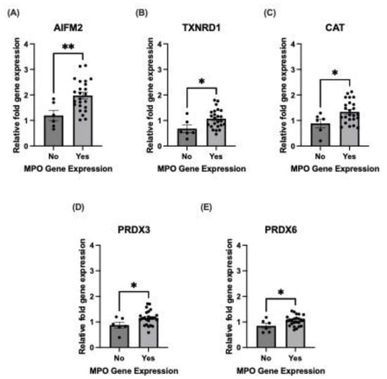 Antioxidant genes were upregulated with MPO gene expression in non-CAD patients. Relative fold gene expression was evaluated in ECFCs without CAD at baseline in (A) AIFM2, (B) TXNRD1, (C) CAT, (D) PRDX3 and (E) PRDX6. Each sample was performed in triplicate. N = 30; no MPO gene expression: N = 6, MPO gene expression: N = 24. Data are represented as mean ± S.E.M. * p < 0.05, ** p < 0.01, Student’s t-test was performed.