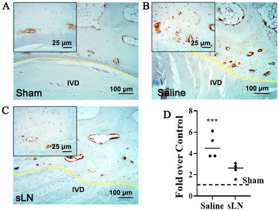 Immunohistochemistry of NLRP3 expression in a degenerative IVD model. Rabbit IVDs from a puncture model were given a single injection of either saline or sLN. Sham animals were used as controls. Twelve weeks following injection, IVDs were processed for immunohistochemistry and the detection of NLRP3. Higher-magnification inset images are included and demarcated to highlight specific areas of interest. Immunohistochemistry of NLRP3 in (A) sham and degenerative IVDS treated with (B) saline or (C) sLN. (D) Densitometry of NLRP3 expression in IVDs presented in (A). Statistical significance was assessed using Student’s t-test (comparison between saline and sLN); ***, p < 0.001; n = 4. (IVD—intervertebral disc, NLRP3—nucleotide-binding domain, leucine-rich repeat, and pyrin domain-containing 3, yellow dotted line—endplate).