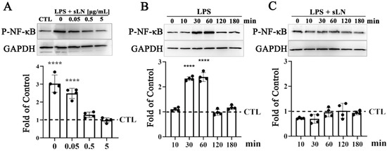Evaluation of NF-κB activation in human nucleus pulposus cells treated with sLN and LPS. (A) Human nucleus pulposus (NP) cells were treated with LPS alone or in combination with sLN with the indicated concentrations (0.05, 0.5, or 5.0 μg/mL) for 45 min. Western blotting was performed to detect activation of P-NF-κB. Blots were normalized to GAPDH for loading by densitometry and calculated as a fold increase over control. The densitometry of the blots is presented in the graph below. (B) HNP cells were incubated with LPS alone or (C) LPS and 0.5 μg/mL sLN for the indicated times (0–180 min). P-NF-κB signal was normalized to GAPDH and calculated as a fold-over control. Statistical significance was assessed using ANOVA and post hoc Dunnett’s test (comparison to control); ****, p < 0.0001; n = 4. Original Western blot images are available in Supplementary Materials.