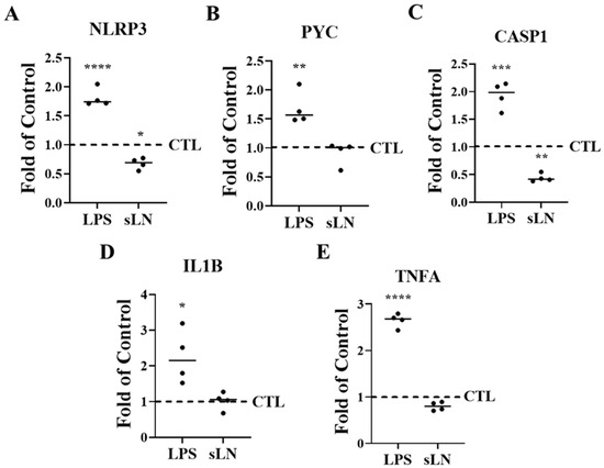 Suppression of inflammasome markers by sLN. HNP cells were incubated for 48 h in medium supplemented with LPS or LPS and 0.5 μg/mL sLN. Control samples were incubated with medium alone. RNA expression is shown for (A) NLRP3, (B) PYC, (C) CASP1, (D) IL1B, and (E) TNFA. Treatments were compared to controls. ANOVA and post hoc Dunnett’s test; *, p < 0.05; **, p < 0.01; ***, p < 0.001; ****, p < 0.0001; n = 4.