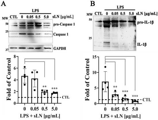 To explore the regulatory effect of sLN on inflammasome activation markers [20,38,39,40,41], hNP cells were subjected to a 48 h treatment with LPS alone and in combination with sLN.