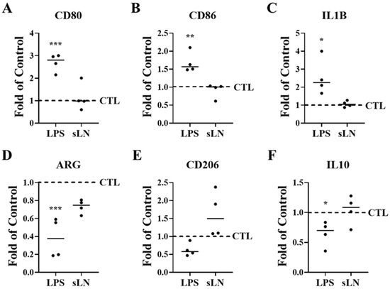 In contrast, the expression levels of arginase (ARG) and IL10, which are markers of the M2 macrophage phenotype involved in tissue repair, were significantly reduced (Figure 5D–F) following LPS incubation. Additionally, the expression of the M2 marker CD206 showed a decreasing trend.